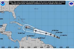 Secondo l’Istituto, nelle prossime 24/48 ore, Beryldovrebbe inclinare la sua traiettoria in direzione nord-ovest ovest, con pochi cambiamenti d’intensità e con tendenza a dissolversinel fine settimana prima di raggiungere le Piccole Antille, dove le condizioni nei livelli superiori dell’atmosfera non sono favorevoli.