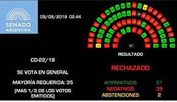 Buenos Aires, 9 ago (Prensa Latina) Il Senato dell'Argentina ha respinto oggi il disegno di legge per depenalizzare l'aborto, un dibattito storico nella nazione australe dove 38 dei 72 legislatori hanno votato contro l'iniziativa.