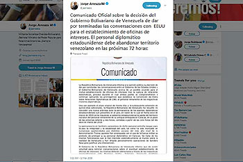 Il governo venezuelano ha precisato che dopo aver raggiunto il termine per le negoziazioni senza concretarsi un accordo, ha deciso di non concedere una nuova proroga ed ha stabilito un termine di 72 ore affinché il personale rimanente dell’antica ambasciata statunitense a Caracas possa abbandonare il territorio nazionale.