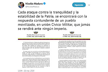 Al rispetto, Maduro ha aggiunto nella rete sociale Twitter che “ogni attacco contro la tranquillità e la stabilità della Patria, si troverà con la risposta contundente di un popolo mobilitato, in unione civico-militare, che non si arrenderà mai davanti a nessun impero”.