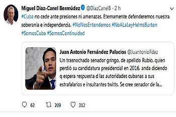 Diaz-Canel ha segnalato il twitter di Juan Antonio Fernandez, ambasciatore di Cuba in Austria, Croazia e Slovenia, nel quale definisce insultante e stramba la pretesa del senatore statunitense Marco Rubio che Cuba risponda al suo twitter.