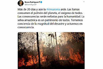 Nel suo account di Twitter, il capo della diplomazia cubana ha sottolineato che sono già più di 20 giorni in cui “le fiamme consumano il polmone del pianeta, l’ossigeno di tutti”.
