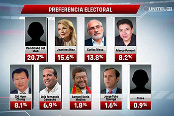 Più in basso nella lista appaiono Marco Pumari e Luis Fernando Camacho col 8,2% ed il 6,9 % rispettivamente: bisogna chiarire che il sondaggio è stato fatto prima che entrambi i politici presentassero le loro candidature ufficiali come binomio per le prossime elezioni.
