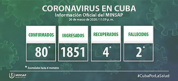 L'Avana, 27 mar (Prensa Latina) Le autorità sanitarie di Cuba hanno informato oggi che il totale di casi confermati è arrivato a 80 mentre sono stati dimessi tre pazienti.