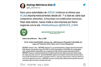 Nel suo messaggio, il titolare cubano ha richiamato l’attenzione sul comunicato dell’Ufficio di Controllo degli Attivi Stranieri (OFAC), del Dipartimento del Tesoro che ha stabilito la multa per 257862 dollari all’azienda statunitense di alimenti Biomin America Inc.