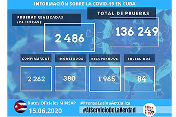 Cuba riporta oggi 14 nuovi casi positivi alla COVID-19 per un accumulato di 2262, 17 pazienti sono stati dimessi, per un totale di 1965 persone guarite.