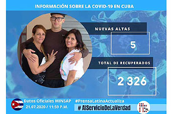 L'Avana, 22 lug (Prensa Latina) Dopo cinque nuove guarigioni, la quantità di pazienti recuperati dalla COVID-19 a Cuba è arrivata a 2326, ha risaltato oggi il Ministero di Salute Pubblica.