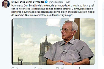 L'Avana, 31 lug (Prensa Latina) Il presidente cubano, Miguel Diaz-Canel ha trasmesso oggi le sue condoglianze ai familiari ed agli amici dello Storiografo de L'Avana, Eusebio Leal Spengler per la sua scomparsa nella mattinata, vittima di una penosa malattia.