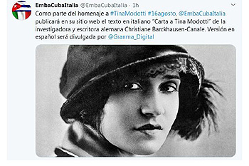 Considerata una delle migliori fotografe del XX secolo, con una vita fuori da tutti i canoni dell’epoca, la militante comunista italiana ha professato un amore incommensurabile per il giovane rivoluzionario cubano Julio Antonio Mella, afferma un comunicato dell’ambasciata dell’isola.