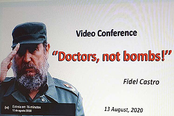 La video conferenza ha avuto come titolo l’espressione di Fidel Castro “Medici sì, bombe no!”, frase usata dal Comandante nel maggio del 2003 davanti ad una moltitudine nella Facoltà di Diritto dell’Università di Buenos Aires, in riferimento alla consacrazione dei professionisti e scienziati cubani a salvare vite negli angoli più oscuri del pianeta.