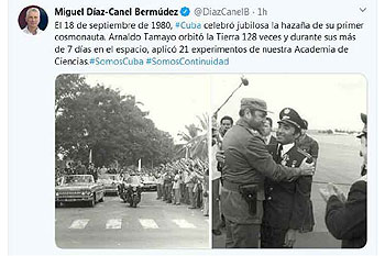 L'Avana, 18 set (Prensa Latina) Il presidente di Cuba, Miguel Diaz-Canel, ha ricordato il primo cosmonauta latinoamericano, il cubano Arnaldo Tamayo, del cui volo nello spazio si realizzano 40 anni.