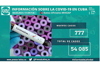 L'Avana, 5 mar (Prensa Latina) Cuba registra oggi 777 nuovi casi diagnosticati con il virus SARS-CoV-2, causa della COVID-19, dimissioni ospedaliere di 796 pazienti e cinque decessi per malattia, nelle ultime ore.