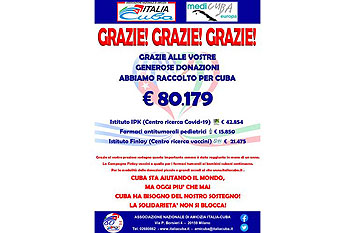 Nelle dichiarazioni a Prensa Latina, il presidente dell’associazione, Marco Papacci, ha precisato che 42.854 euro ricevuti nel 2020 tramite donazioni sono stati inviati all’Istituto di Medicina Tropicale Pedro Kourí, mentre prosegue la campagna a favore dell’Istituto Finlay dei Vaccini e di medicine antitumorali pediatriche.