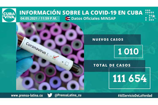 L'Avana, 5 mag (Prensa Latina) Cuba oggi ha riportato 1.010 persone con diagnosi della COVID-19, che aumenta a 111.654 il numero totale di casi confermati con la malattia in questa nazione caraibica dall'anno scorso.