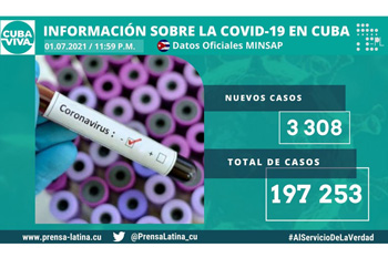 L'Avana, 2 lug (Prensa Latina) Le autorità sanitarie cubane hanno notificato oggi 3.308 nuove persone contagiate da SARS-CoV-2, causa della COVID-19, e 20 decessi nelle ultime ore per complicazioni della malattia.