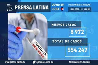 L'Avana, 19 ago (Prensa Latina) Le autorità sanitarie cubane hanno notificato oggi 8.972 nuovi contagiati da SARS-CoV-2, causa della COVID-19, e 79 decessi nelle ultime ore per complicazioni della malattia.