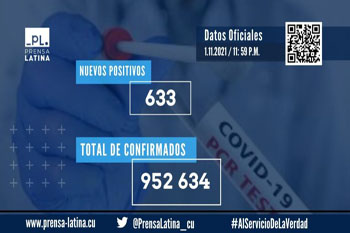 L'Avana, 1° nov (Prensa Latina) Cuba ha segnalato oggi 633 nuove persone con diagnosi della COVID-19, che portano a 952.633 il totale confermato con la pandemia dallo scorso anno.