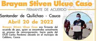 Brayan Ulcue era attualmente in fase di re-incorporazione e faceva parte dello spazio territoriale per la formazione e la reintegrazione, Carlos Perdomo, situato nel comune di Caldono, dipartimento del Cauca, ha affermato l’Istituto degli Studi per lo Sviluppo e la Pace (Indepaz).