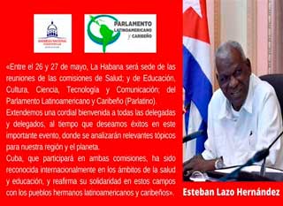 L'Avana, 24 mag (Prensa Latina) Cuba ospiterà una riunione del Parlamento latinoamericano e caraibico (Parlatino), ha comunicato oggi Esteban Lazo, presidente dell'Assemblea Nazionale del Potere Popolare dell'isola (parlamento).