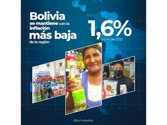 “Bolivia continua ad essere forte e stabile agli occhi del mondo. A luglio del 2022, la nostra inflazione ha raggiunto l’1,6%, mantenendo il livello più basso nella regione”, ha scritto sul suo account di Twitter.