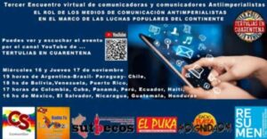 Buenos Aires, 18 nov (Prensa Latina) Il ruolo dei media nelle odierne lotte popolari è stato al centro dei dibattiti del Terzo Incontro dei Giornalisti Antimperialisti dell'America Latina. Celebrato attraverso piattaforme digitali, l'evento ha visto la partecipazione di professionisti provenienti da Argentina, Perù, Brasile, Uruguay, Cile, Colombia, Venezuela, Bolivia, Paraguay, Ecuador, Cuba, Porto Rico, Panama, Salvador, Messico ed altri paesi.