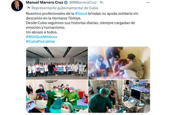 L'Avana, 21 feb (Prensa Latina) Il primo ministro Manuel Marrero ha evidenziato oggi il lavoro degli operatori sanitari cubani che collaborano nella cura delle persone ferite dai terremoti che hanno recentemente colpito Turchia.
