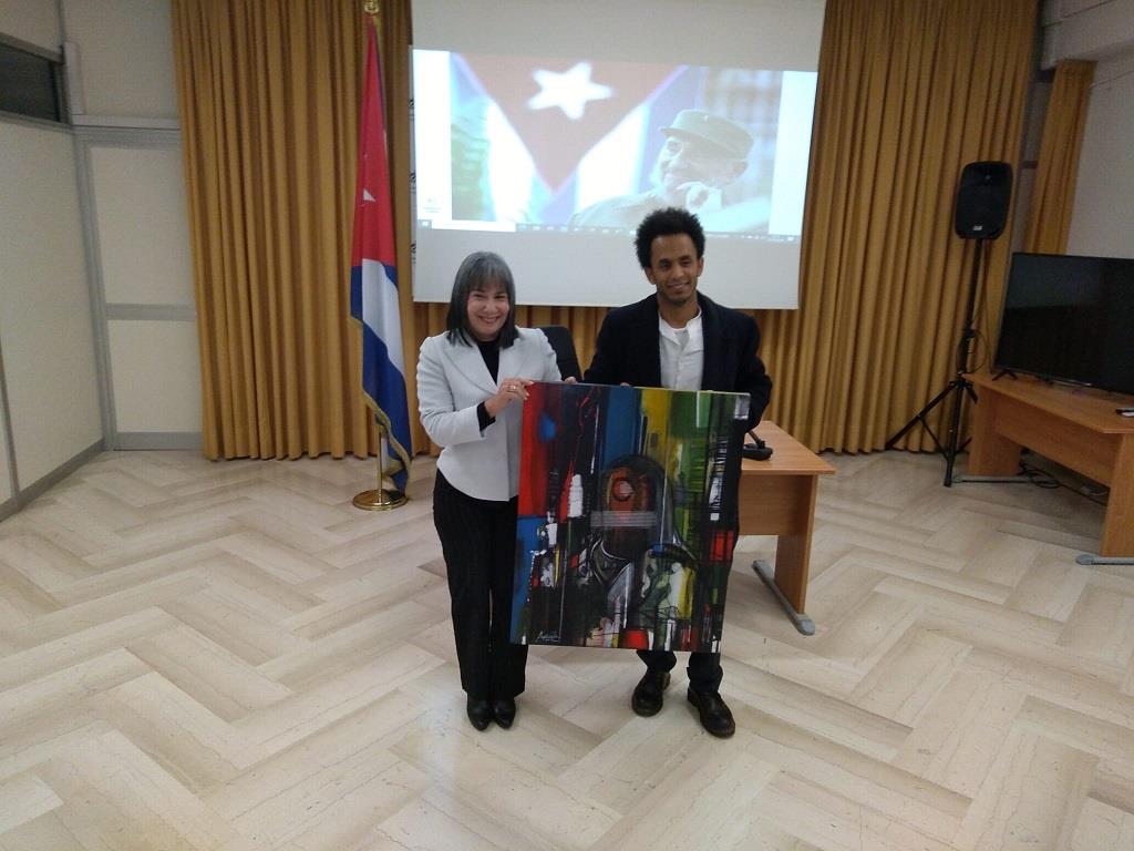 Durante la cerimonia in cui è stata ufficializzata la consegna di questo dipinto, l’Ambasciatrice Mirta Granda ha ringraziato l’artista per questa iniziativa in omaggio alla commemorazione, che sarà il 1° gennaio, della vittoria nel 1959 delle forze rivoluzionarie al comando del Comandante in Capo, Fidel Castro.