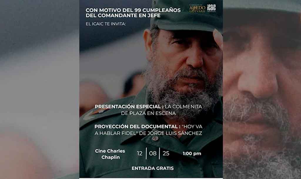 Queste proiezioni in onore dello storico leader della Rivoluzione cubana si svolgeranno nei cinema Yara, Charles Chaplin, Acapulco, Riviera, La Rampa e Multicine Infanta, tutti a L’Avana.